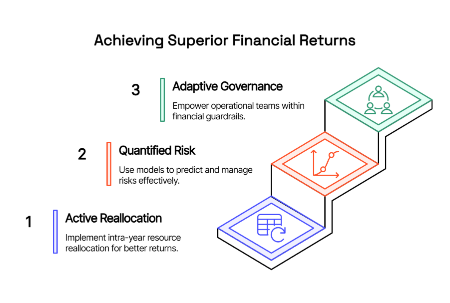 • Adaptive governance replaces central bottlenecks. Finance sets financial guardrails, and operational teams act with freedom inside those limits, ensuring their decisions are measured against enterprise targets.